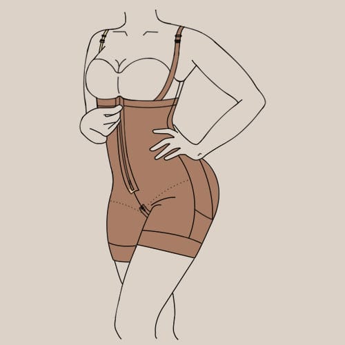 1. Make sure all hooks, clasps and zippers are open From a sealed position lake the bodysuit by the sides and put one foot at a time into i Pull the bodysuit up to your knees.